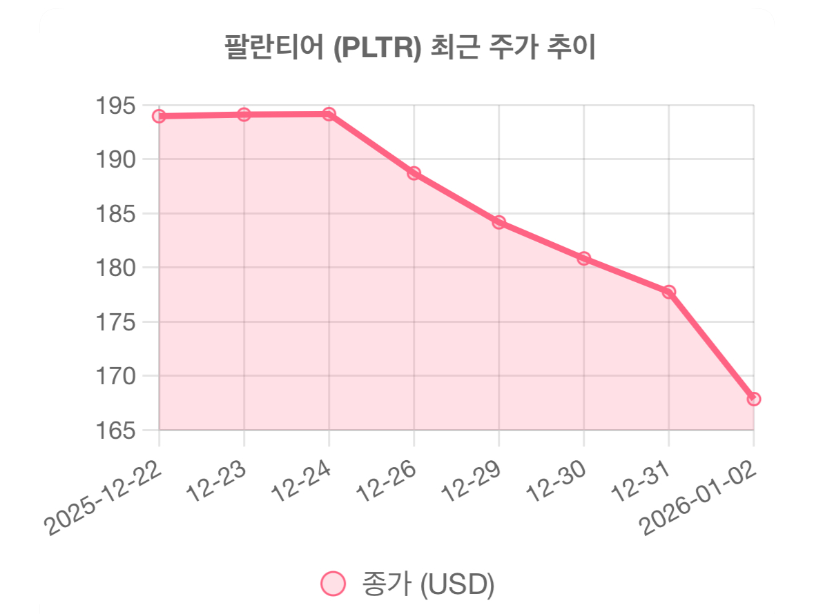 새해 벽두부터 팔란티어(PLTR) 주주님들의 마음이 편치 않으실 것 같습니다. 2025년 한 해 동안 138%라는 폭발적인 상승을 보여주며 'AI 대장주'로 군림했던 팔란티어가, 연말연시 5거래일 연속 하락하며 심상치 않은 조정을 받고 있습니다.