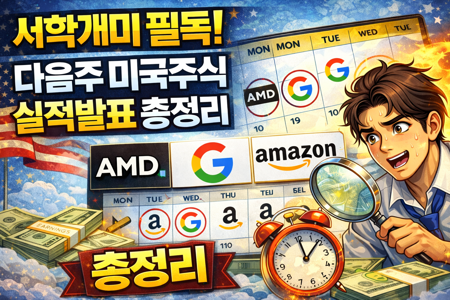 이번 주는 AI 반도체의 2인자 AMD부터 클라우드와 검색 광고의 제왕 구글(알파벳), 그리고 이커머스의 절대강자 아마존까지 실적 발표가 대기하고 있습니다. 내 포트폴리오의 운명을 가를 슈퍼 위크, 놓치면 안 될 관전 포인트를 정리해 드립니다. 📝