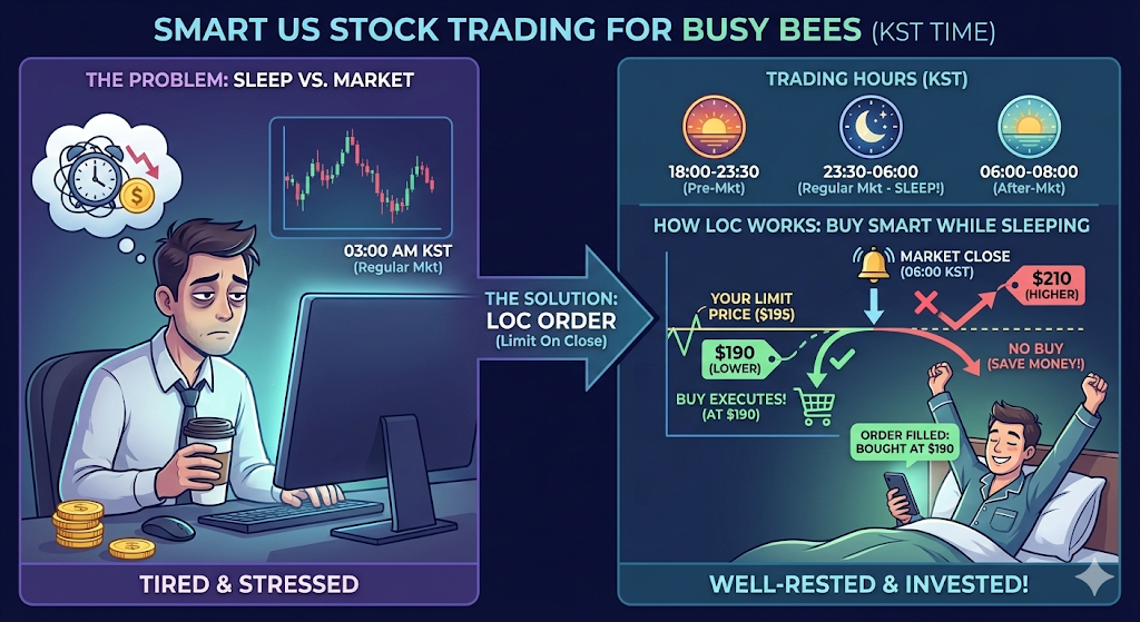 건강도 지키고 수익도 지키고 싶은 여러분을 위해, 오늘은 꿀잠 자면서도 원하는 가격에 주식을 사는 마법의 주문 LOC 매수와 거래 시간을 완벽하게 정리해 드립니다. 😴💸