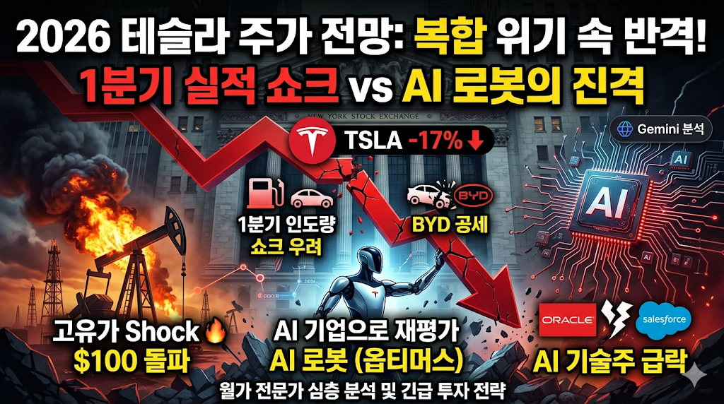 현재 2026년 3월 말 기준, 테슬라(TSLA) 주가는 연초 대비 약 17% 하락하며 370달러 선까지 억눌려 있는 상태입니다. 최근 중동발 유가 폭등(배럴당 100달러 돌파)과 미국 증시 기술주 전반의 투심 악화가 겹치면서 시장의 변동성이 극도로 커지고 있습니다. 과연 테슬라는 이 위기를 극복하고 다시 날아오를 수 있을까요? 지금부터 테슬라를 둘러싼 3대 위기 요인과 반전의 열쇠, 그리고 월가 전문가들의 목표주가를 한눈에 보기 쉽게 정리해 드리겠습니다.1. 현재 테슬라 주가를 짓누르는 3가지 핵심 위기 요인테슬라의 주가 하락은 단순한 거시경제 분위기 때문만은 아닙니다. 기업 내부의 펀더멘탈 측면에서 분명한 경고등이 켜져 있습니다.1분기 인도량 쇼크 및 단기 수요 둔화: 다가오는 4월 22일 1분기 실..