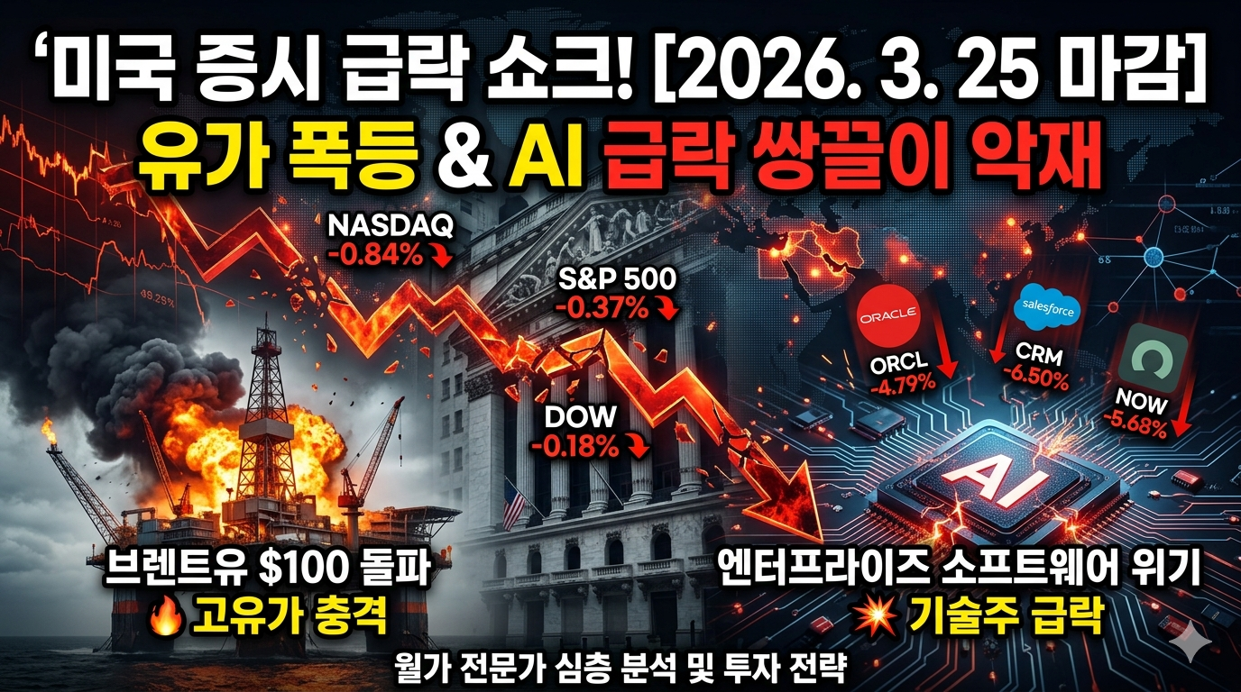2026년 3월 24일(현지시간) 뉴욕 증권거래소(NYSE)에서 미국 주요 3대 지수는 중동발 지정학적 리스크의 장기화, 국제 유가의 재급등, 그리고 인공지능(AI) 기술 혁신이 불러온 엔터프라이즈 소프트웨어 섹터의 충격이 맞물리며 일제히 하락 마감했습니다. 불과 하루 전 트럼프 미국 대통령의 ‘5일간의 이란 에너지 시설 공격 보류 및 종전 협상’ 시사 발언으로 연출되었던 안도 랠리는 단 하루 만에 신기루처럼 사라졌습니다. 시장은 협상 진위에 대한 강한 의구심을 드러내며, 다시 한번 '고유가-고금리-성장 둔화'라는 스태그플레이션(Stagflation) 시나리오를 자산 가격에 적극적으로 반영하기 시작했습니다.1. 뉴욕 증시 3대 주요 지수 마감 수치이날 시장은 장 초반부터 유가 움직임에 극도로 민감하게 반..